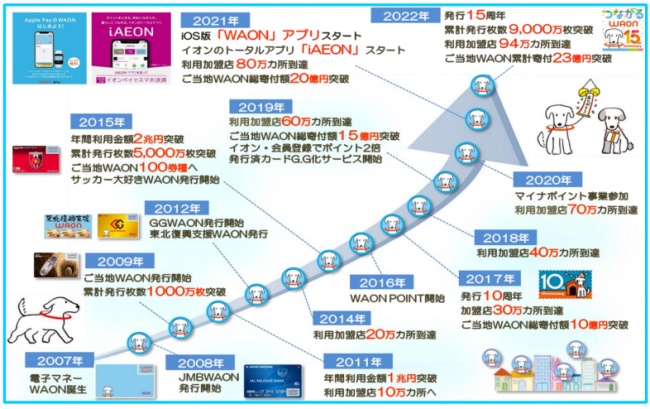 イオン(株)(千葉市美浜区、吉田昭夫社長)の電子マネー「WAON」が2022年4月で15周年を迎えた。累計発行枚数は約9000万枚、利用加盟店数全国94万カ所以上、年間利用金額は2兆円を超えた。