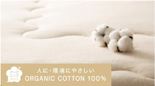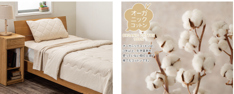 昨年、累計年間販売数が160万枚以上と好評だった「天然素材寝具シリーズ」は、今年はオーガニックコットン、コットンベロア、コットンガーゼ、コットンリネン、コットンウォッシュ、コットンパイル ビンテージ、フレンチリネン混、トロトロレーヨンの8種類に拡大された。オーガニックコットンは、3年以上化学薬剤を使っていない畑で育てたコットンのこと。