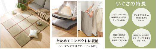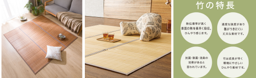 また、おうち時間を過ごすリビングでの暮らしに、涼しいと感じる「⽵ラグ」や天然由来の吸放湿で部屋を快適に保つ「い草ラグ」もおすすめだ。