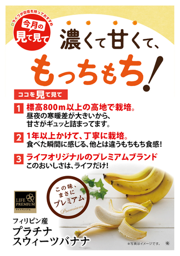ライフが自信をもってすすめる「今月の見て見て」の近畿圏5月商品に「ライフプレミアム フィリピン産プラチナスウィーツバナナ」が選ばれている。