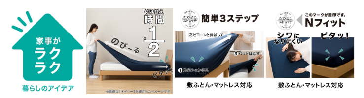 第2弾ではシーツの「Nフィット パレット」(7色展開)シングルサイズ 1990円を1790円に、「Nフィット コットン」(4色展開)シングルサイズ2990円を2790円に、多機能レースカーテン「エコナチュレボーダー」(幅100㎝×高さ108㎝2枚入り)3861円を3490円で販売する。ほかにもバスマットや収納ボックスなどを用意する。