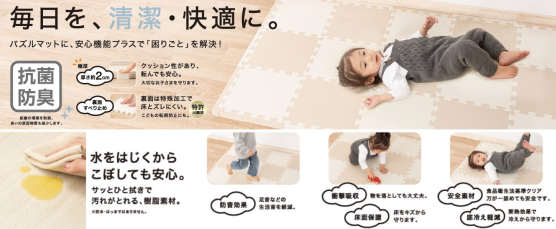 なかでも、ケガ防⽌や、落下物の衝撃による床の傷防⽌、マンション住まいであれば⾜⾳の騒⾳対策など、とくに⼦育て時に⼤活躍するパズルマットは、累計販売数900万セットを突破した。そのパズルマットに、3歳未満の⾚ちゃんも安⼼して使用できる、全年齢対象の抗菌パズルマットを新たに投入した。抗菌防臭機能に加え、従来の厚さ1cmの倍の、約2cmの極厚タイプで、クッション性・防⾳性がアップしている。さらに、裏⾯のすべり⽌め加⼯で床とズレにくく、より安全に利⽤できるようになった。