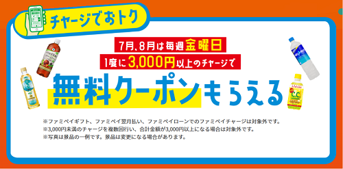 一つは、毎月10日、25日の2回実施している「チャージの日」を、キャンペーン期間中は毎週金曜日に実施する。「1度に3000円以上のファミペイチャージ」で対象者全員にファミペイの無料引換クーポンを進呈する。