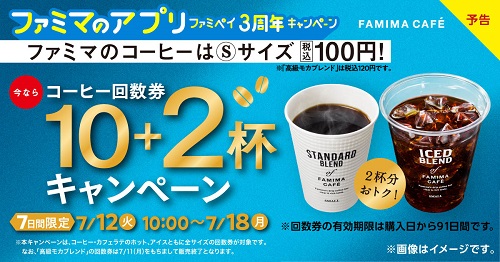 二つ目は7月12日(火)10時から7月18日(月)23時59分までの7日間限定で、「ファミペイ ファミマカフェ回数券10+2杯キャンペーン」を行う。ファミマカフェ10杯分の値段で通常は1杯分をサービスするが、期間中は2杯分のサービスとなる。