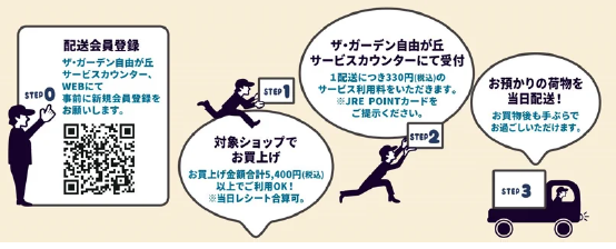 サービスの対象はJREポイントの会員限定で、対象ショップで5400円(税込み、以下同じ)以上購入することが条件だ。当日のレシートを合算することもできる。受付は「ザ・ガーデン自由が丘」のサービスカウンター。1配送につき330円のサービス利用料がかかる。個数制限、荷重制限はないが、梱包レジ袋代は有料。受付時間は10時~5時。