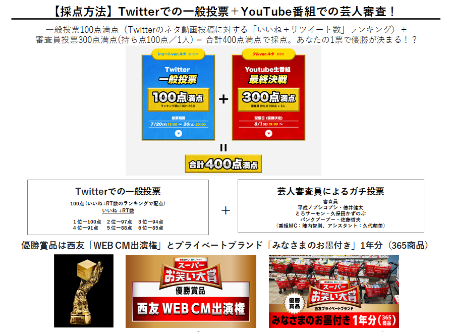 一般投票の順位は、7月20日(水)12時~7月30日(土)20時に西友公式Twitterアカウントから投稿されるネタ動画への「いいね・リツイート」数によって決定する。この順位にお笑い芸人の審査が加わる最終決戦は8月1日(月)19時から行われ、その様子を吉本興業公式YouTubeチャンネルで生番組として配信する。