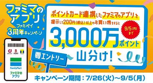 「ポイントカード連携のお買い物で3000万ポイント山分けキャンペーン!!」は、「ファミペイ」に、dポイントカード、楽天ポイントカード、Tカードいずれかのポイントカードを登録・連携し、キャンペーン期間中にファミリーマートでファミペイのバーコードをスキャンしたうえ、200円(税込)以上の買物をした人全員に、3000万ポイントを山分けして進呈する。