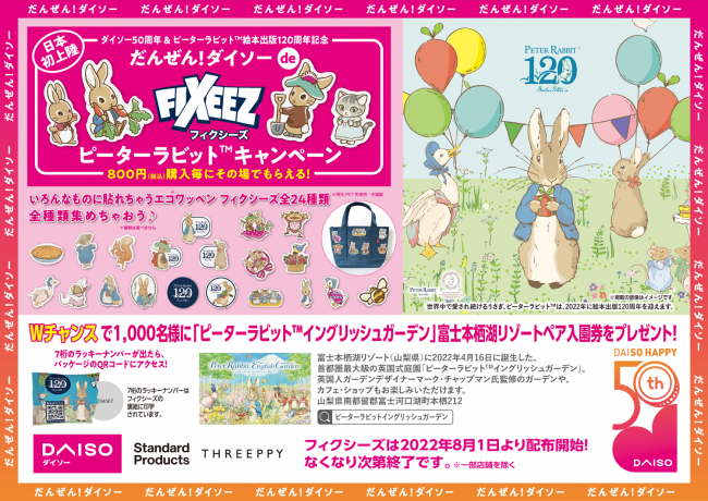 (株)大創産業(広島県東広島市、矢野靖二社長)は8月1日(月)から、 全国のDAISO(ダイソー)、Standard Products by DAISO(スタンダードプロダクツ バイ ダイソー)、 THREEPPY(スリーピー)約3100店で、800円(税込)買い上げごとにワッペンをプレゼントする「だんぜん!ダイソーde フィクシーズ ピーターラビット(TM)キャンペーン」を開催する。特設サイトも公開している。