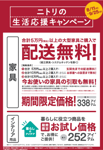また、家具の⽣活応援キャンペーンは9⽉25⽇まで継続して実施する。税込み合計5万円以上の購⼊で、配送料無料(組⽴家具・システムキッチンを除く)および338アイテムを期間限定価格で提供する。