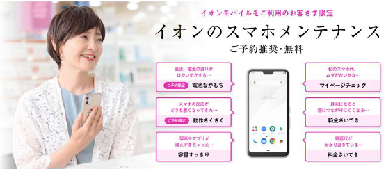 「スマホメンテナンス」は、スマホ本体のトラブルの解消や適切な料金プランへの見直しなど、顧客の利用状況に合わせて、店頭スタッフがさまざまな改善点について提案するとともに、手続きを手助けするイオンモバイル利用者限定のサービス。
