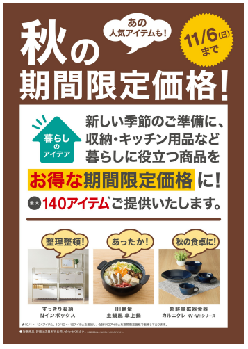 (株)ニトリ(札幌市北区、武田政則社長)は 10⽉1⽇(土)から11⽉6⽇(⽇)まで「期間限定価格」を実施する。期間中、新しい季節の準備にぴったりな収納・キッチン⽤品など暮らしに役⽴つ最⼤140アイテムを、「期間限定価格」で提供する。