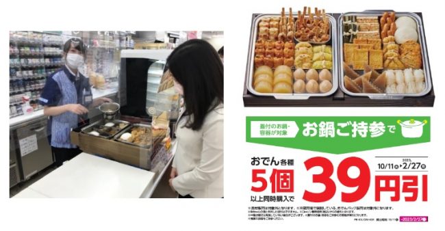 蓋付きの容器を持参して、おでん5個以上を同時購入した顧客を対象に「39円引き」販売する。「おでん鍋割セール」を実施する店舗では、専用の販促物を店内に掲出し、実施の告知を行う。