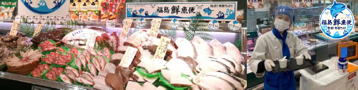 「福島鮮魚便」はイオンリテールと福島県、福島県漁業協同組合連合会(JF福島漁連)が協力して福島県で水揚げされた新鮮な魚を全国に先駆けて限定店舗へ届ける取り組み。専門の販売スタッフによる接客を通して、鮮度と品質の良さを顧客に伝える。