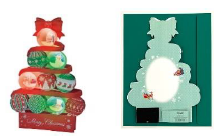 クリスマスカラーの赤、緑、白でデザインされたオーナメントをツリー状に積み重ねた、立てて飾れるカード。ボタンを押すと、「ひいらぎかざろう」の曲に合わせて、透明素材のオーナメントが光る。暖炉とサンタ、教会と雪だるまなど、透明素材の中にクリスマスの小さな世界が表現されている。1760円。