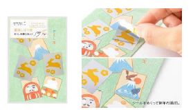 おみくじのように、シールをめくって運試しが楽しめるおとし玉袋。カードのシールをめくると、対になった同じモチーフの絵柄があらわれる。440円。