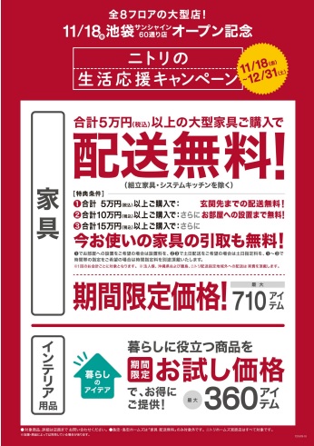 (株)ニトリ(札幌市北区、武田政則社長)は、11⽉18⽇(⾦)の「池袋サンシャイン60通り店」オープンを記念し、11⽉18⽇~12⽉31⽇までの期間限定で「⽣活応援キャンペーン」を全国で実施する。家具は配送料無料、家具・インテリア用品合わせて最大1070アイテムを期間限定価格で提供する。