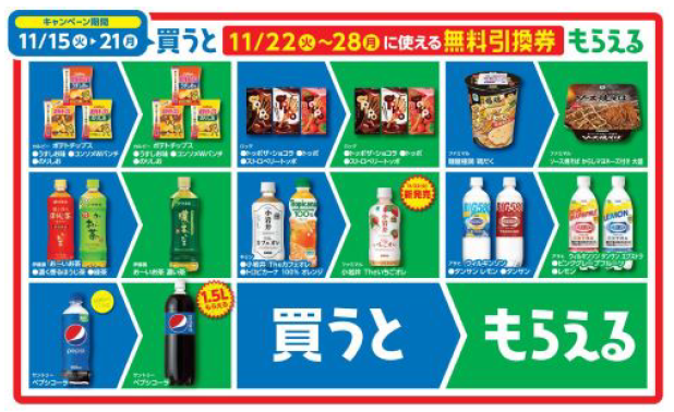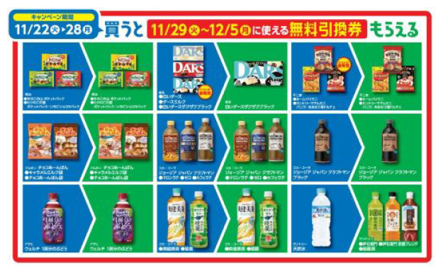 対象商品は、明治の「きのこの山 ポケットパック」、森永の「ダース」、不二家の「ホームパイミニ」「カントリーマアムミニ」、ブルボンの「チョコあ~んぱん」、コカ・コーラの「ジョージア ジャパン クラフトマン440ml」「爽健美茶 600ml」「綾鷹 525ml」、アサヒの「ウェルチ 一房分のぶどう 470ml」、サントリーの「天然水 550ml」など。
