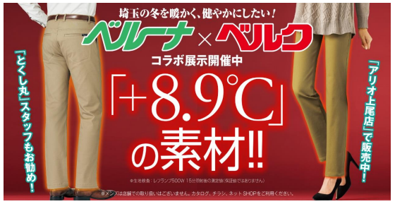 11月24日(木)~12月25日(日)の期間中、ベルーナが取り扱っている「+8.9℃」素材を使用した「静電防止!蓄熱綿サテンカラーパンツ」「<コムルヴァン・オム>ラクしてすっきり暖かパンツ」をベルク上尾春日店に展示する。