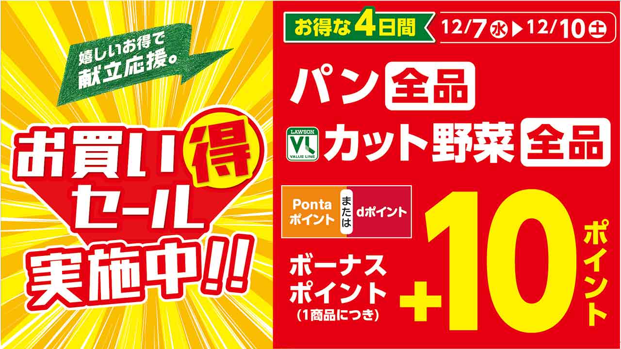 さらにパン全品と「VL(Value Line)」カット野菜各種を対象に、Pontaカード、あるいはdポイントカードを提示して購入すると、10ポイントのボーナスポイントをプレゼントするキャンペーンを同時開催する。