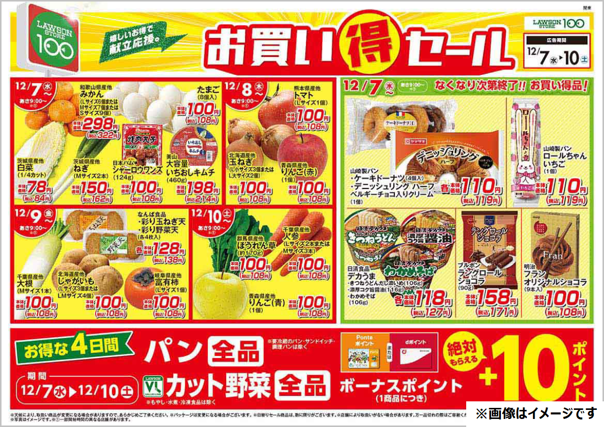 第1弾は12月7日(水)から12月10日(土)までで、野菜や果物を日替わりで、また食品、菓子などをお買い得価格で提供する。