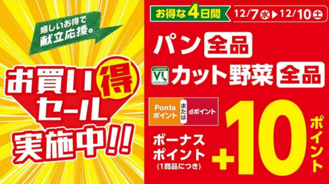 また、12月7日(水)から12月10日(土)まで、ローソンストア100でPontaカードまたはdポイントカードを提示し、パンや、ローソンストア100のプライベートブランド「VL(Value Line)」のカット野菜を購入すると、1点につき10ポイントのボーナスポイントをプレゼントするキャンペーンも同時開催する。