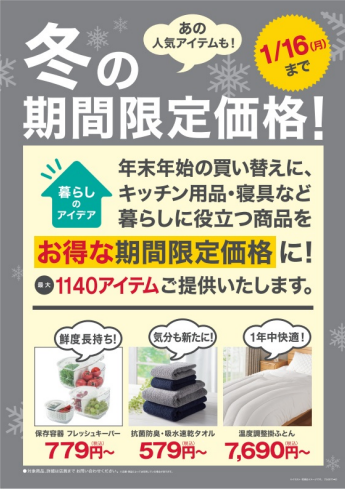 (株)ニトリ(札幌市北区、武田政則社長)は12⽉16⽇(金)から1⽉16⽇(月)まで「期間限定価格」を実施する。期間中、寒い冬や年末年始の時期にぴったりな寝具やキ ッチン・バス⽤品など暮らしに役⽴つ最⼤1140アイテムを、「期間限定価格」で提供する。