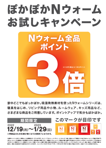 (株)ニトリ(札幌市北区、武田政則社長)は12⽉19⽇(⽉)〜1⽉29⽇(⽇)まで期間限定で、「ぽかぽかNウォームお試しキャンペーン」を実施する。キャンペーン期間中は、Nウォームシリーズ購⼊時に、ニトリポイントを3倍付与(税込み110円につき3ポイント)する。