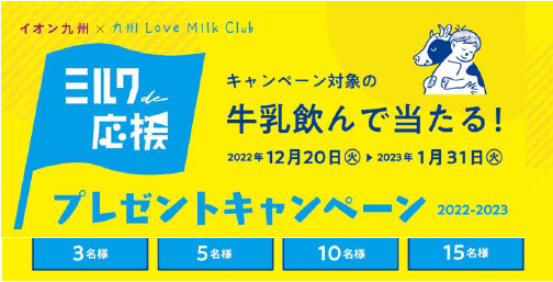 イオン九州(株)(福岡市博多区、柴田祐司社長)は 12月20日(火)~2023年1月31日(火)の期間、九州生乳販売農業協同組合連合会(福岡市博多区、中村 隆馬理事会長:九州 Love Milk Club)とともに「ミルク de 応援 プントキャンペーン 2022-2023」を実施する。
