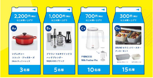 「ミルク de 応援プレゼントキャンペーン」は、九州内の「イオン」「イオンスタイル」「マックスバリュ」「ザ・ビッグ」248店舗で実施する。対象の牛乳を購入すると、抽選で家電がプレゼントされる。