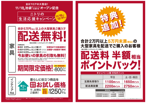 また合計5万円(税込)以上の⼤型家具・⼤型家電を購入した場合、配送料無料(組⽴家具・システムキッチンを除く)のサービスも行っている。また、税込み合計2万円から5万円未満の⼤型家具配送の注⽂では、配送料⾦半額相当のポイントバックも実施している。