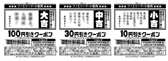 キャンペーンの目玉は、総額1.5億円分が当たる、「新春おみくじクーポン」だ。期間中、大吉は100円引き、中吉は30円引き、小吉10円引きと、運勢に応じて割引価格が変わる、総額1.5億円分の「新春おみくじクーポン」がレシートに印字される。全てのレシートクーポンには、氷川さんのメッセージが入っている。クーポンは100円以上の買物で1会計1回のみ使用可能だ。