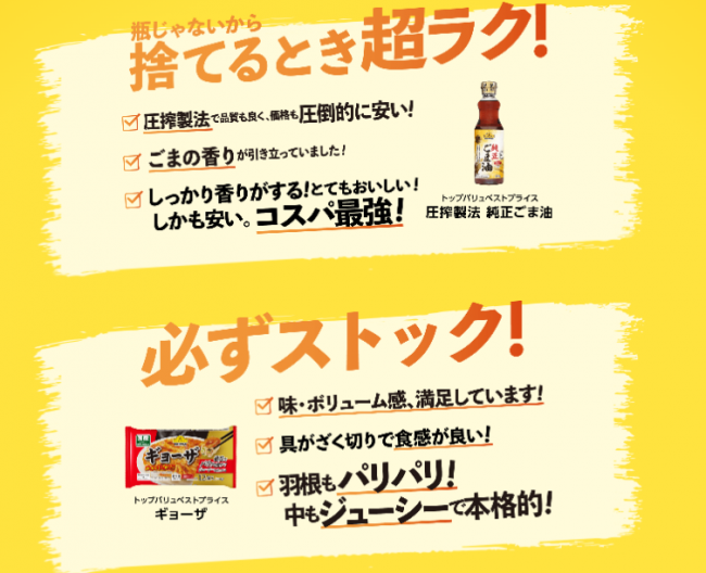 「トップバリュベストプライスギョーザ」「トップバリュプロテインバー」「トップバリュグリーンアイオーガニックブロッコリー」などトップバリュ各ブランドから選定されていて、店頭サイネージおよび同社サイト上で、従業員による選定やアピールポイントとともにプロモーションが強化される。