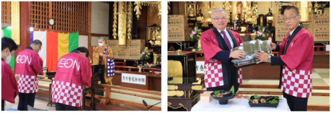 イオン琉球(株)(沖縄県南風原町、鯉渕豊太郎社長)は1月20日(金)、那覇市若狭の護国寺で、節分に販売する恵方巻に使用する焼き海苔、約8万8000枚に厄除祈願をした。この海苔を使用した恵方巻は沖縄県内のイオン、マックスバリュ、ザ・ビッグ全48店舗で販売される。