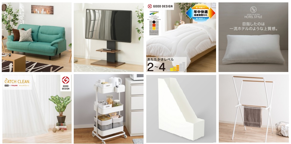 対象商品は、ソファやダイニングセット、ベッドなどの家具が最大900アイテム。またカーテンや寝具、便利なキッチン⽤品、収納⽤品などのインテリア⽤品は最大1022アイテム。新しい⽣活に必要な合計1922アイテムが期間限定価格で提供される。