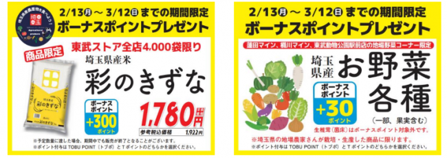 こうしたなか、同社では埼玉県農林部農業ビジネス支援課の県産農産物販売促進特別対策事業の主旨に賛同して、全店で期間・数量限定で埼玉県産の米「彩のきずな」5kgを販売する。購入した顧客に TOBU POINT(トブポ)またはTポイントのいずれか一方に、300ポイントを付与するキャンペーンを実施する。