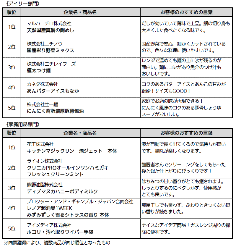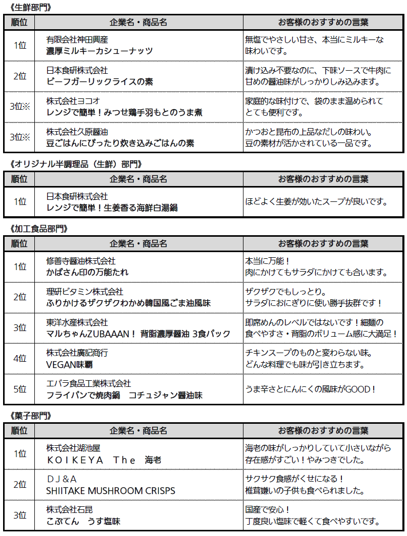 コンクールの候補商品は、対象期間中の売上げ上位商品を、生鮮食品、加工食品、菓子、デイリー、家庭用品の5部門と今回から新設した「オリジナル半調理品(生鮮)」部門の中から選出する。そして、消費者モニターが全候補商品を試食・試用して選考する。