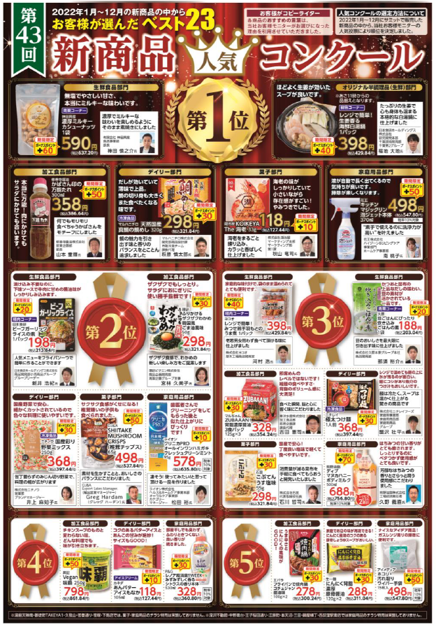 サミット(株)(東京都杉並区、服部哲也社長)が、第43回「サミット新商品人気コンクール」の入賞商品を発表した。入賞商品は、昨2022年の1年間にサミットストアで販売した新商品の中から、サミット消費者モニター約90名による投票で決定される。