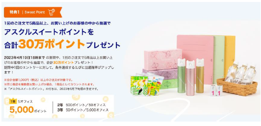 「ASKUL30周年感謝祭」の期間中、このキャンペーンにエントリーすると、1 回の注文で5商品以上まとめて購入した顧客に、合計30万ポイントのアスクルスイートポイントが付与される。1等は5オフィスの顧客に5000ポイントが付与される。期間中何度でも応募できるので、買えば買うほどチャンスが拡がる。