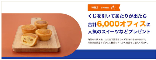 期間中、ASKULで商品を購入した後、注文完了画面のくじ引きに参加し、1~3等の「当たり」が出た顧客合計6000オフィスに人気スイーツなどが付与される。1等は、30オフィスの顧客にスイーツ1年分(毎月、月替わりでスイーツが届く)が当たる。期間中に商品を購入すれば、何度でもくじを引くチャンスは訪れる。