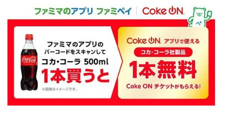 このファミペイスタンプは1個ごとに、全国44万台の「Coke ON」対応自販機でコカ・コーラ社製品1本と無料で交換可能な、「Coke ON」のドリンクチケット1枚と交換できる。「Coke ON」ドリンクチケットの受取・利用には、「Coke ON」アプリのダウンロードが必要になる。