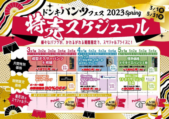(株)ドン・キホーテ(東京都目黒区、吉田直樹社長)は3月1日(水)から5月31日(水)までの3カ月間、メンズインナーパンツ商品を対象にしたお得な企画満載のキャンペーン「ドンキ パンツフェス ー2023 Springー」を、全国のドン・キホーテ系列店舗で開催する。