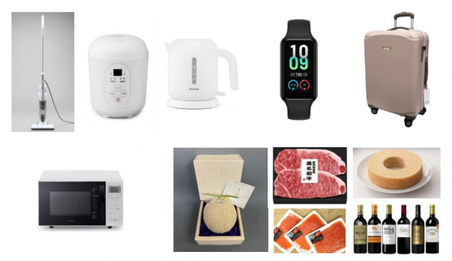 「生活用品」は、アイリス家電3点セット、サイクロンクリーナー、布団クリーナー、IH炊飯ジャー、西川羽毛布団、AMAZFIT スマートウオッチ、ダイヤモンドピアス、ネックレスなど、24品目。