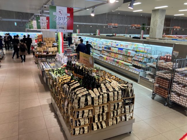 3月15日(水)、旗艦店であるヤオコー南古谷店ではイタリア大使館貿易促進部エリカ・ディ ジョヴァンカルロ部長を招き、川野社長による店舗案内が行われた。主通路上に設けられたプロモーションコーナーでは直輸入ワインを集合させたコーナーや関連商材であるプロシュートや各種チーズの展開もされた。