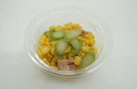 「香川県産アスパラの冷製コーンバター」は、甘さと柔らかさが特長の「香川県産アスパラ」を使用した。アスパラと相性の良いコーンとベーコンをバターで炒めた。260円。