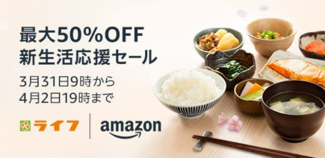 (株)ライフコーポレーション(東京本社:東京都台東区、大阪本社:大阪市淀川区、岩崎高治社長)は、3月31日(金)9時から4月2日(日)19時まで、Amazon上のライフネットスーパーでおすすめの生鮮食品や惣菜、厳選したプライベートブランド商品を最大50%OFFで販売する「新生活応援セール」を開催する。