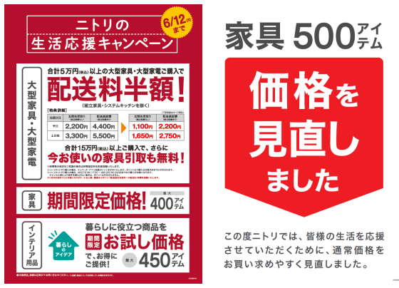 ニトリnews|4/28から生活応援キャンペーン/配送料半額・引き取り無料
