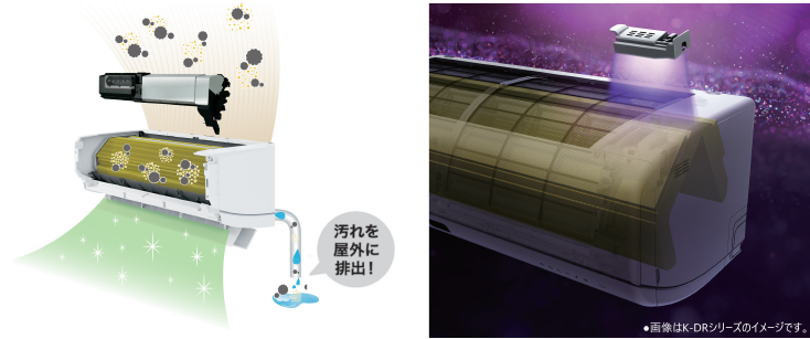 「⼤清快 K-DXシリーズ」最⼤の特徴は、より「清潔」な空気を送り続けるための機能が充実していること。静電気の⼒でPM2.5まで吸着・屋外排出させる空気清浄機能「プラズマ空清」に加え、汚れやすい熱交換器をUV照射する「UV除菌ユニット」を搭載している。さらに、運転停⽌後に⾃動でエアコン内部を乾燥する「セルフクリーン」機能で、より清潔な空気を簡単に送り続けることができる。また、特許技術の「無⾵感空調」で体に⾵を感じさせずお部屋を快適な温度に整えることができる。
