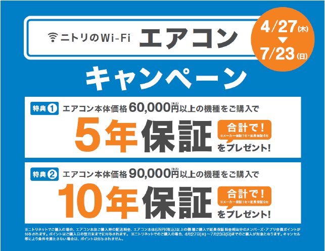 また、ニトリは 4⽉27⽇(⽊)〜7⽉23⽇(⽇)の期間、全国のニトリ店舗とニトリネットで「エアコンキャンペーン」を開催する。