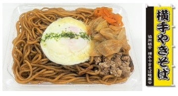 「横手やきそば暖簾会」監修商品。特長であるもちもちとした中太麺と、鰹・昆布の出汁が香るソースを再現した。目玉焼き、挽肉炒め、キャベツ炒め、福神漬けを盛り付けた。