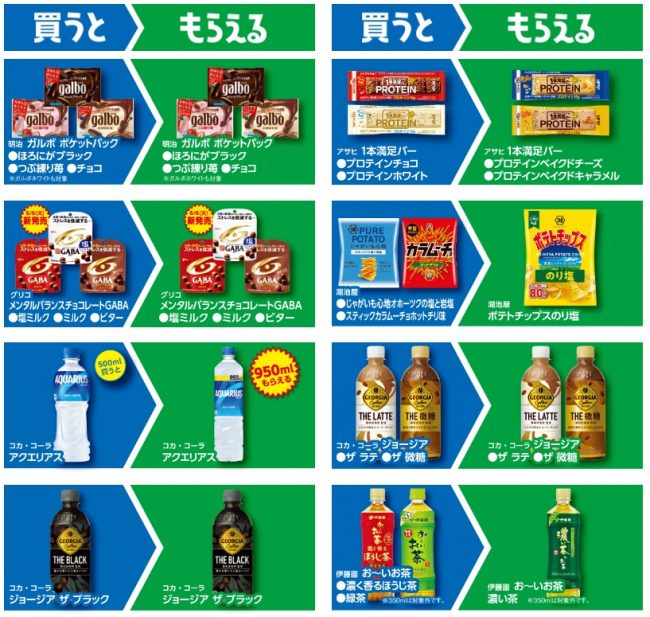このキャンペーンは、さまざまなカテゴリーの人気商品や新商品などを対象に、2021年5月から実施していて、毎回好評を博している。今回は、「アクエリアス 500mlを買うと、アクエリアス 950mlがもらえる」という目玉商品のほか、バラエティ豊かな対象商品をラインアップした。
